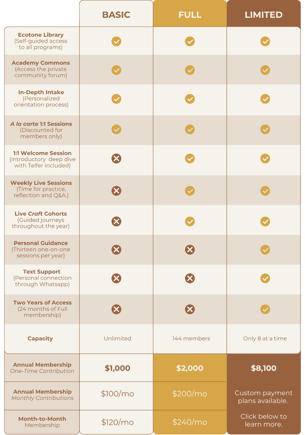 - Our most exclusive tier, limited to just eight participants. This is for the individual ready for a radical, 1-on-1 metamorphosis. In addition to two years of Full Membership, you receive a year of private sessions with me to surgically apply the Ecotone tools to your specific life circumstances. We don’t just navigate the transition — we revel in it.